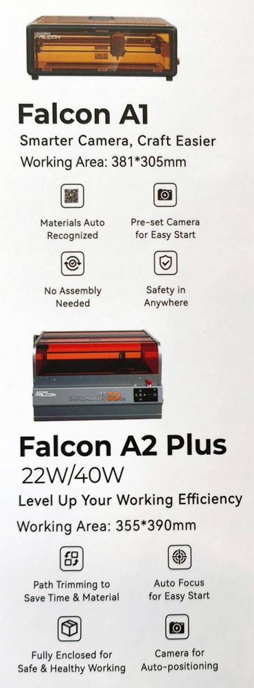 Une nouvelle gamme de graveur laser fait aussi son apparition : le Falcon A1, en version 10W pour l’instant, qui sera ensuite épaulé par le Creality Falcon A2 Plus en 22 et 40W. La surface de travail est respectivement de 381 x 305 mm et 355 x 390 mm. Le A1 est prévu “sans assemblage” et avec reconnaissance automatique du matériau, ce qui serait une évolution considérable des outils laser de CrealityFalcon.