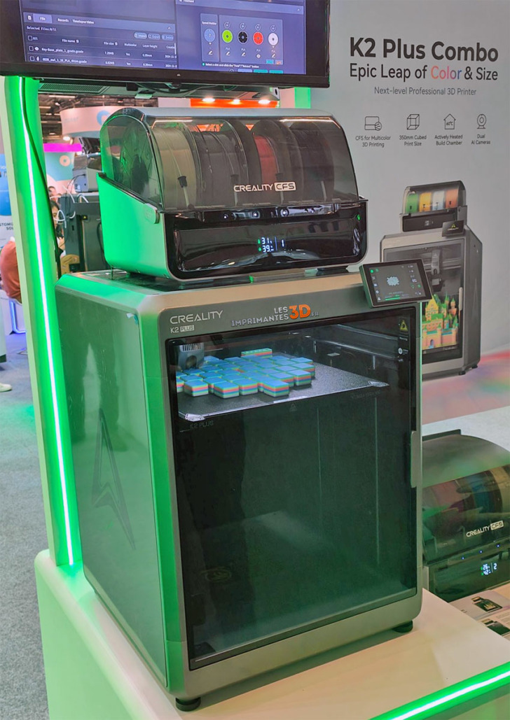 C’est sur la K2 Plus que les visiteurs se tournent sur le stand Creality, accompagné de boitiers multi-filaments CFS pour des impressions en couleurs, mais la marque a aussi dévoilé la Ender-5 Max : volume de 400 x 400 x 400 mm à 700 mm/s de vitesse max.